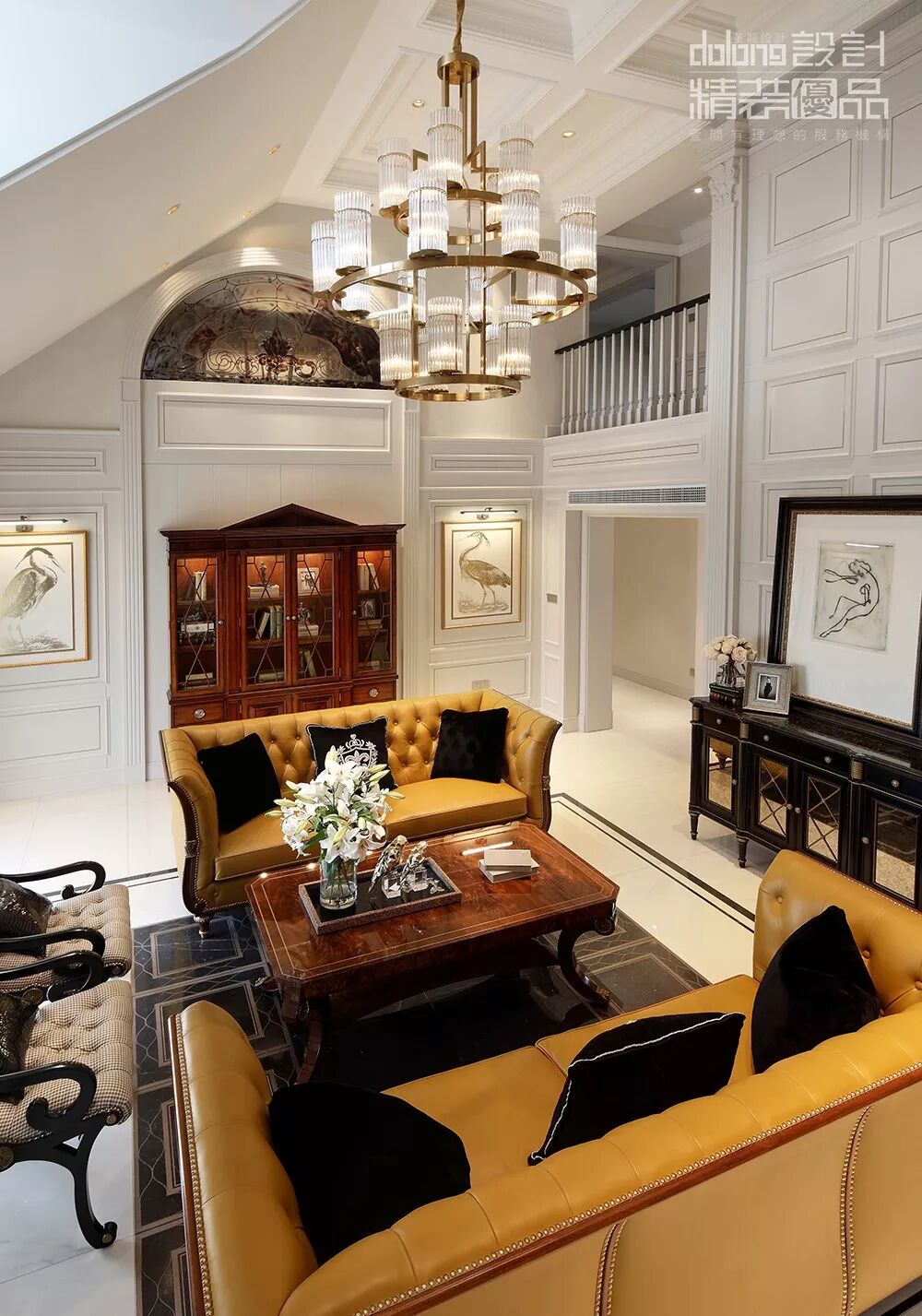花瓣形状的楼梯踏板收口,源于电影《乱世佳人》十二橡园场景楼梯的收口造型,黑色擦金的楼梯扶手用流畅的线条让空间多了灵动和性感。黑金吉娜斯花片的以一种庄重的形式出现在空间,搭配华丽跳跃的姜黄色沙发、黑色的丝绒抱枕,可谓酷劲十足,赋予了空间鲜明风格,演绎先锋的轻奢主题。所有的软装饰品,是高雅与魅力、奢华与温暖的生活写照,凸显出品质生活的严谨性和秩序感。