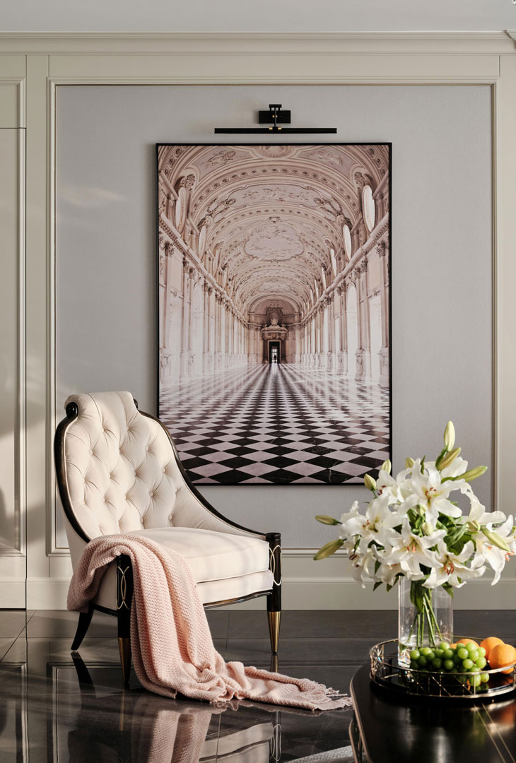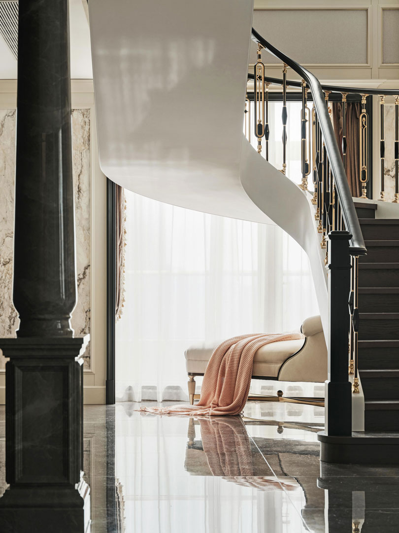 温润的木饰面与硬朗的岩板,包围着线条柔软的新古典造型家具与饰品,为空间注入灵魂的同时,也平衡了空间的繁与简。