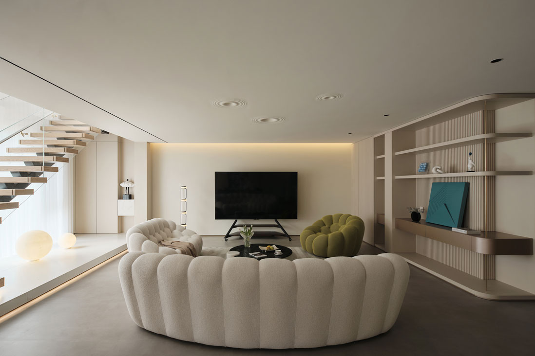 衣帽间中温暖的色彩从隔断墙的缝隙中渗透进起居室,打破了固有主卧套房中功能区域的封闭感,典雅的色彩在深浅交织间融合,空间的松弛感有了具象的表现。