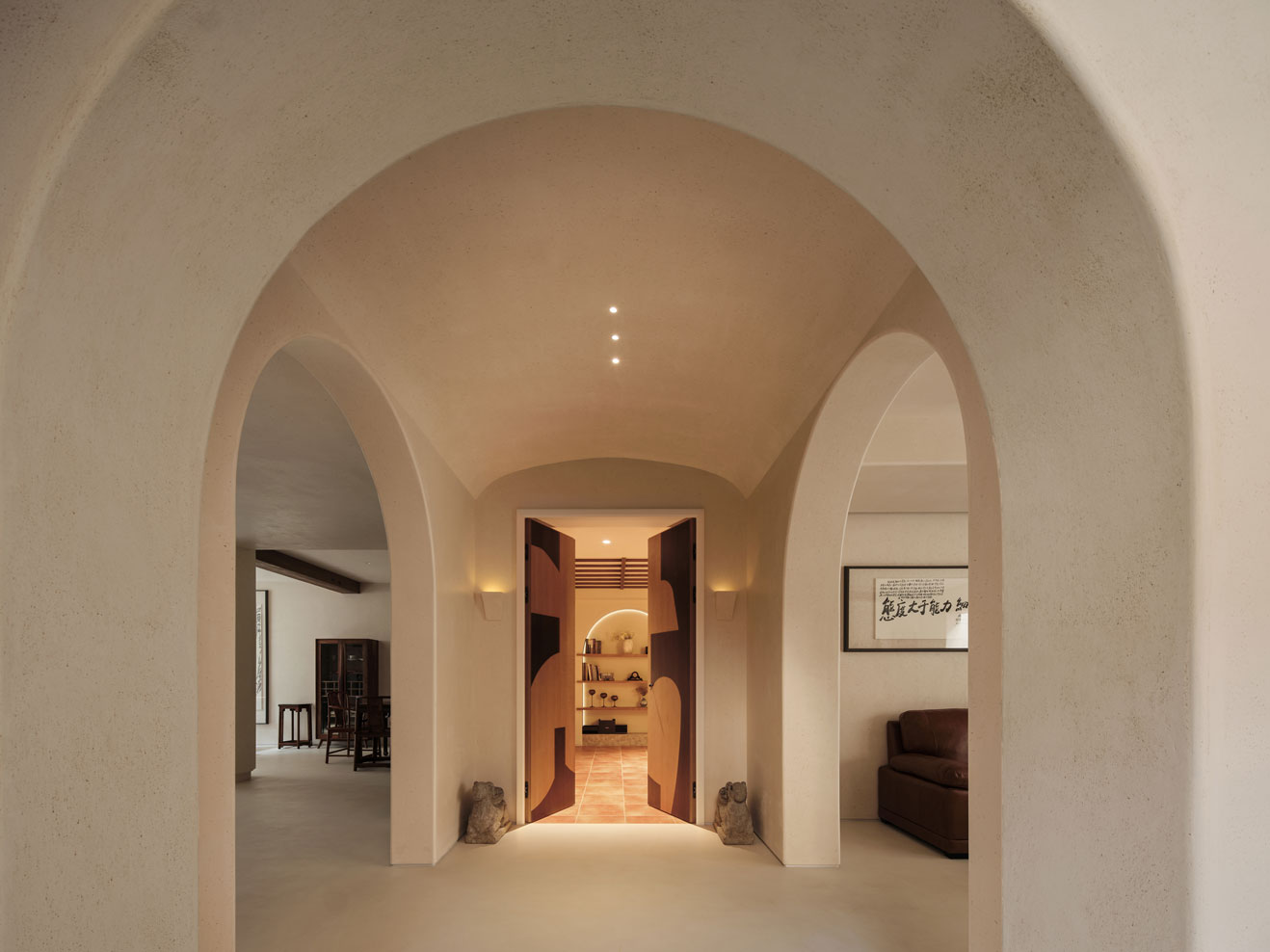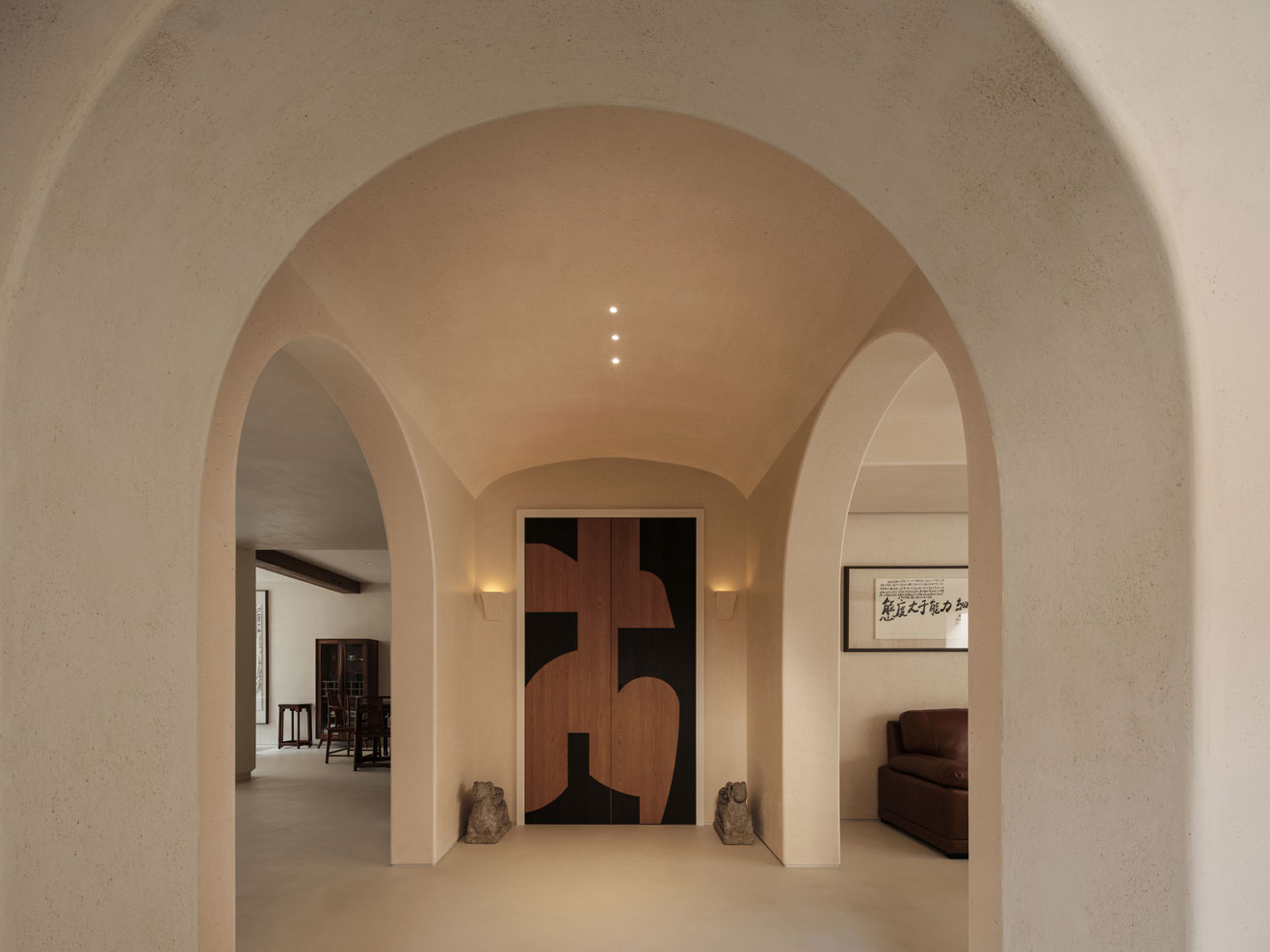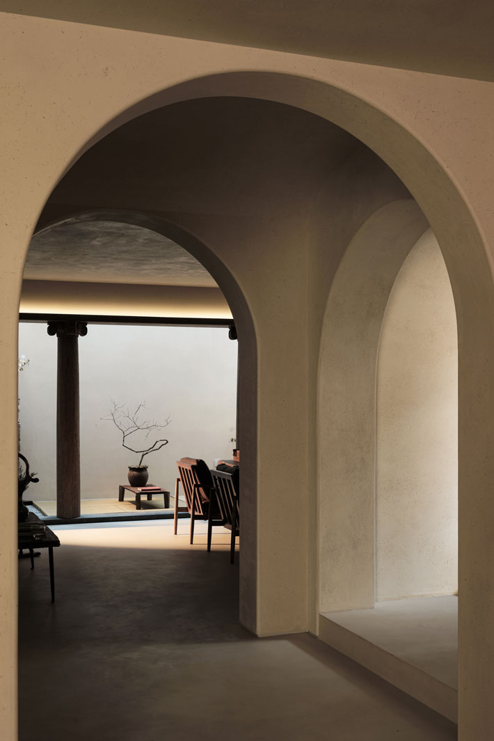 材质的肌理和植物,更容易在自然光线中展示纯粹的美,无需过多的雕刻或装饰,素雅的墙面自然地烘托出空间本色,室内外的流动和互通的关系,在此刻氤氲而生。