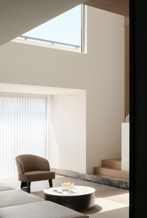 自然光倾斜而下,材料自身的肌理和触感转换为另一种表情。空间内适当的开口和家具组合,相互贯穿、联系,在静谧与平衡的感知中,烘托舒朗的内在体验及感受。