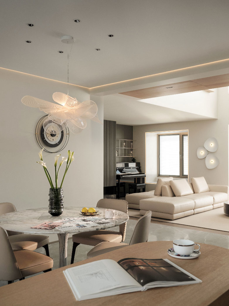 顺着光线的指引,回游型的空间布局将情感由客厅转换到餐厨区域,散发着莹润光泽的吊灯为场域注入波澜,充满烟火与诗意的生活片段随着视角的变化,在眼前一幕幕展开。